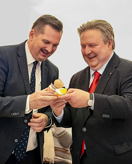Michael Ludwig erfreut sich an der Mundl Ente von Austro Ducks. Sie