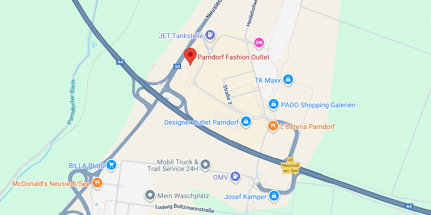 Das Fashion Outlet Parndorf liegt an der Ostautobahn A4 und ist direkt an der Ausfahrt Neusiedl am See – Gewerbepark (Exit 45). Die Fahrtzeit von Wien Zentrum nach Parndorf beträgt etwa 30 Minuten.