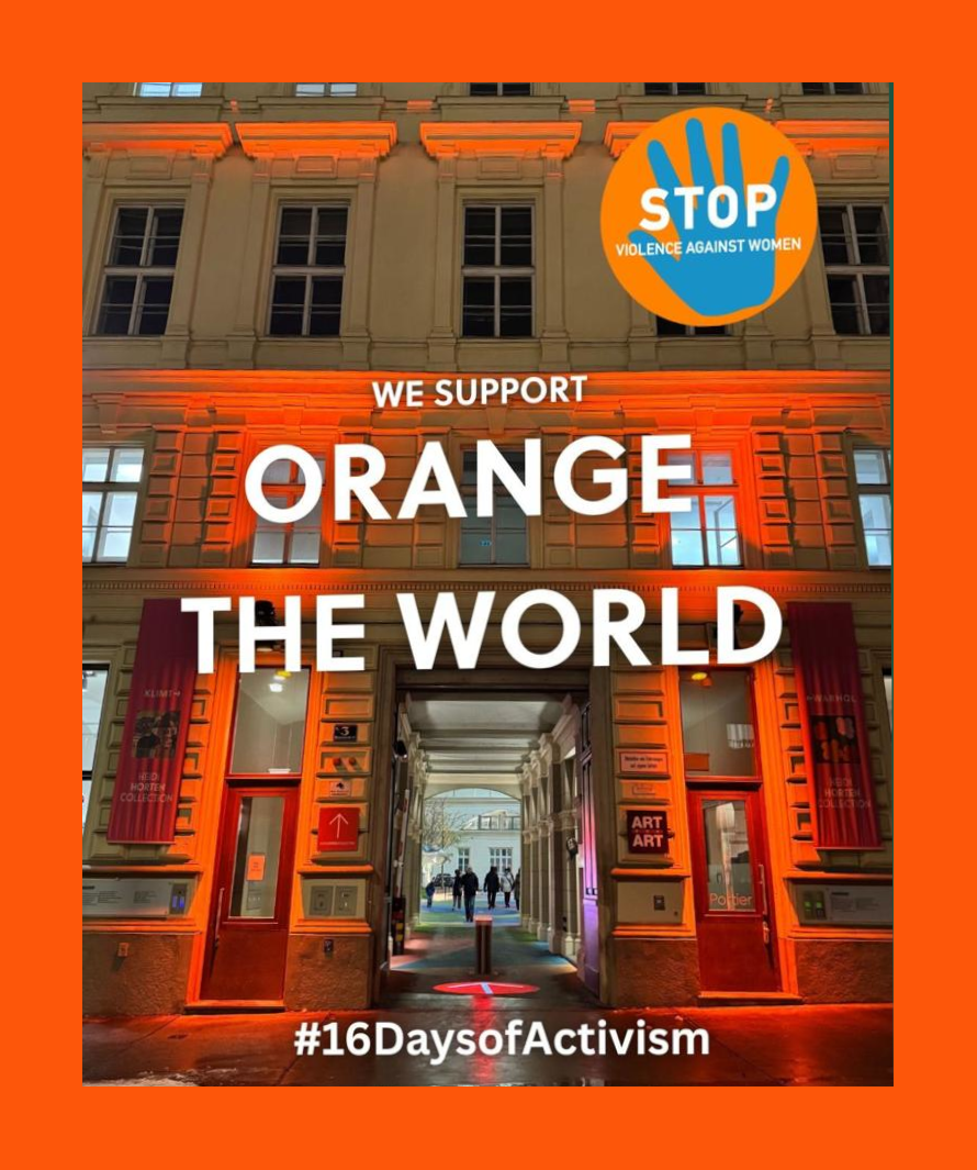 Vom 25.11. bis 10.12.2025 setzt die Heidi Horten Collection gemeinsam mit der Bundestheater-Holding und ART for ART ein sichtbares Zeichen gegen Gewalt an Frauen. In diesem Zeitraum erstrahlt die Fassade des Hanuschhofs in der Wiener Innenstadt in leuchtendem Orange – als Teil der weltweiten UN-Kampagne „Orange The World", die jedes Jahr während der 16 Tage des Aktivismus gegen geschlechtsspezifische Gewalt stattfindet.